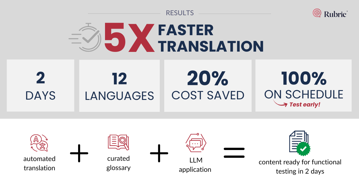 Thanks to Assured AI, we were able to process all 12 languages required within two days, using automated translation enhanced by our LLM application of our curated glossary. This is about five times faster than human translation, and enabled our client to complete testing on time and keep their launch on schedule.
